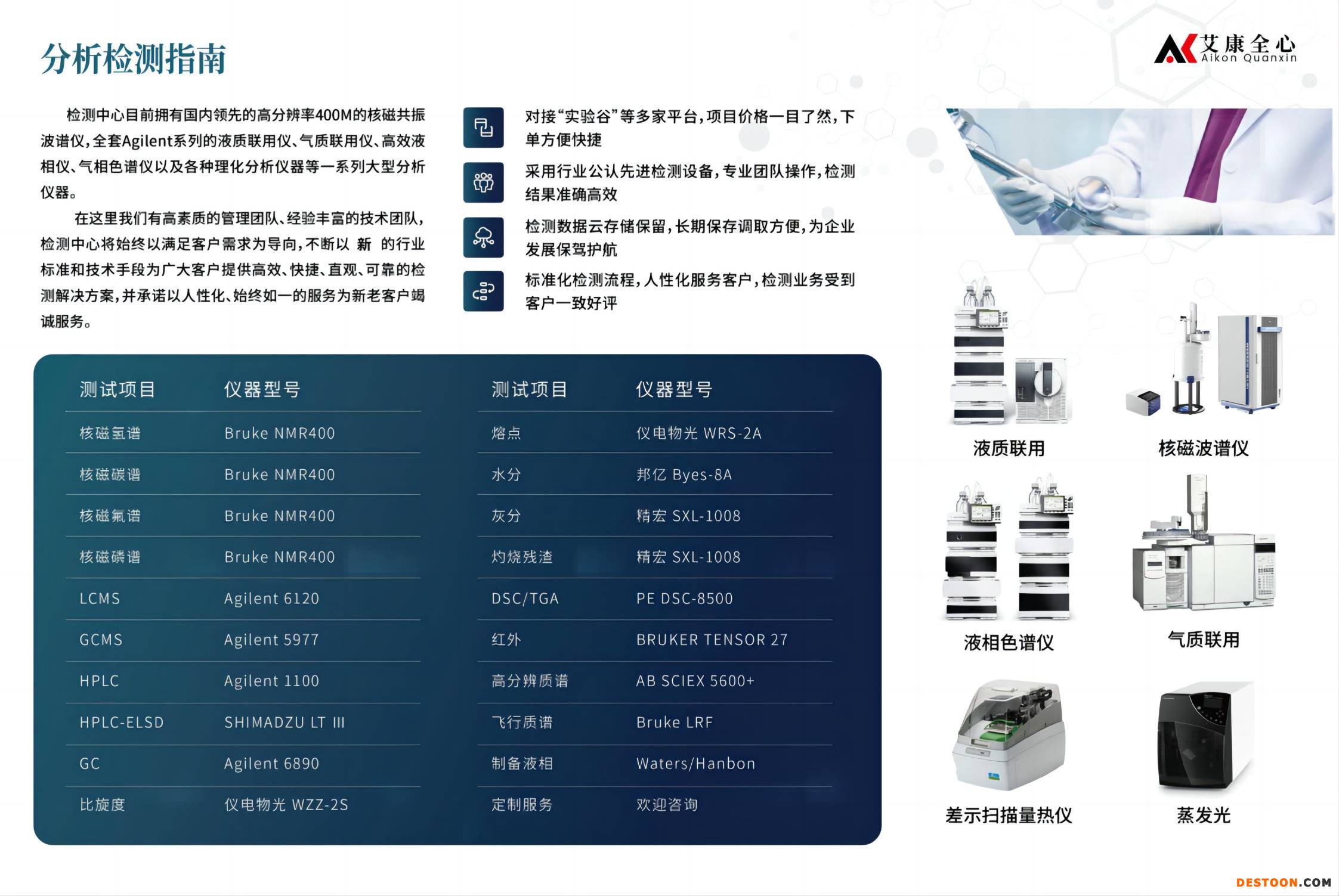 南京艾康全心分析检测中心目前拥有国内xian进的高分辨率400M的核磁共振波谱仪,全套Agilent系列的液质联用仪、气质联用仪、高效液相仪、气相色谱仪以及各种理化分析仪器等一系列大型分析仪器。